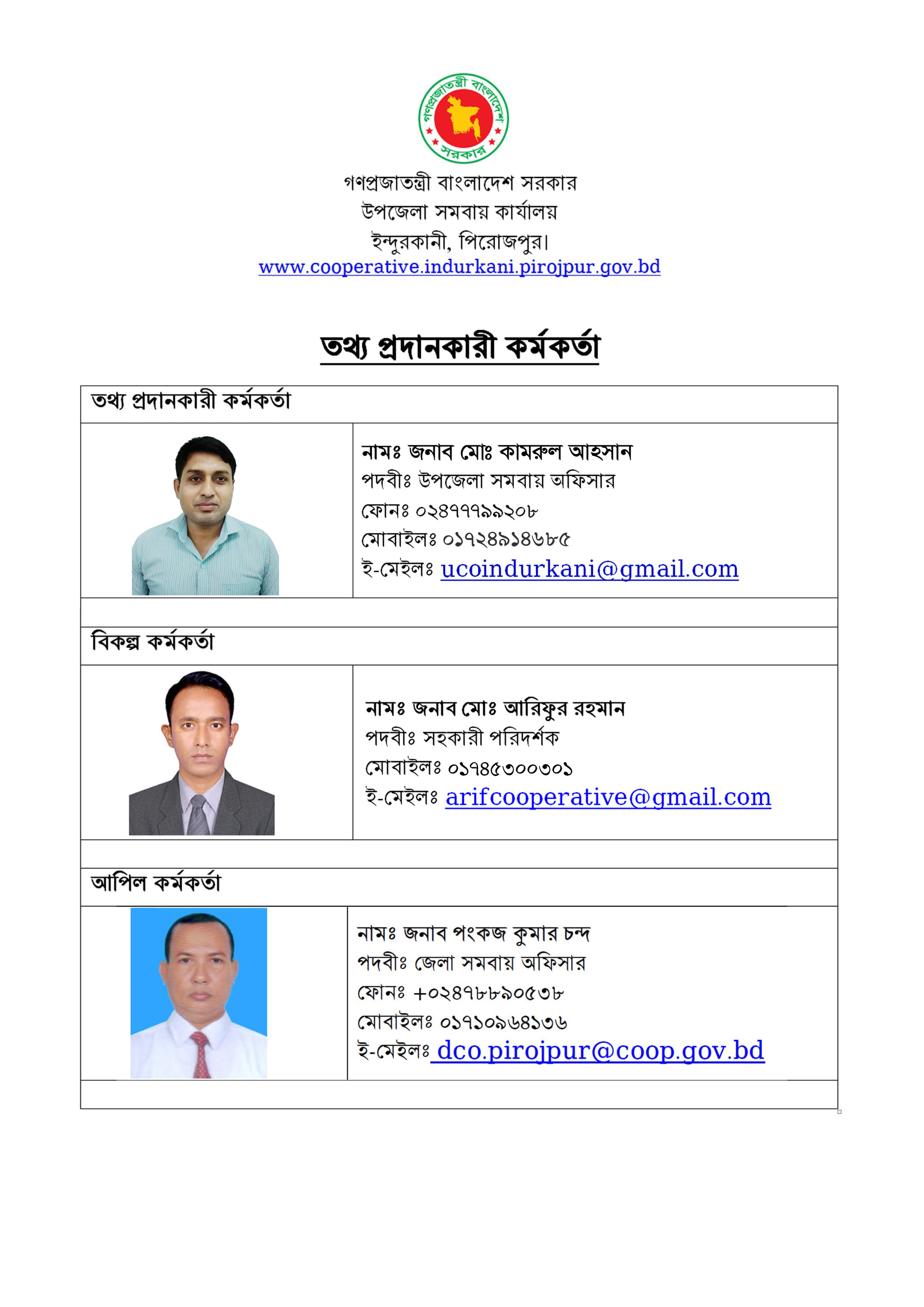 | বিকল্প কর্মকর্তা | মোঃ আরিফুর রহমান সহকারী পরিদর্শক ফোনঃ ০২৪৭৭৭৯৯২০৮ মোবাইলঃ ০১৭৪৫৩০০৩০১ ই-মেইলঃ arifcooperative@gmail.com |